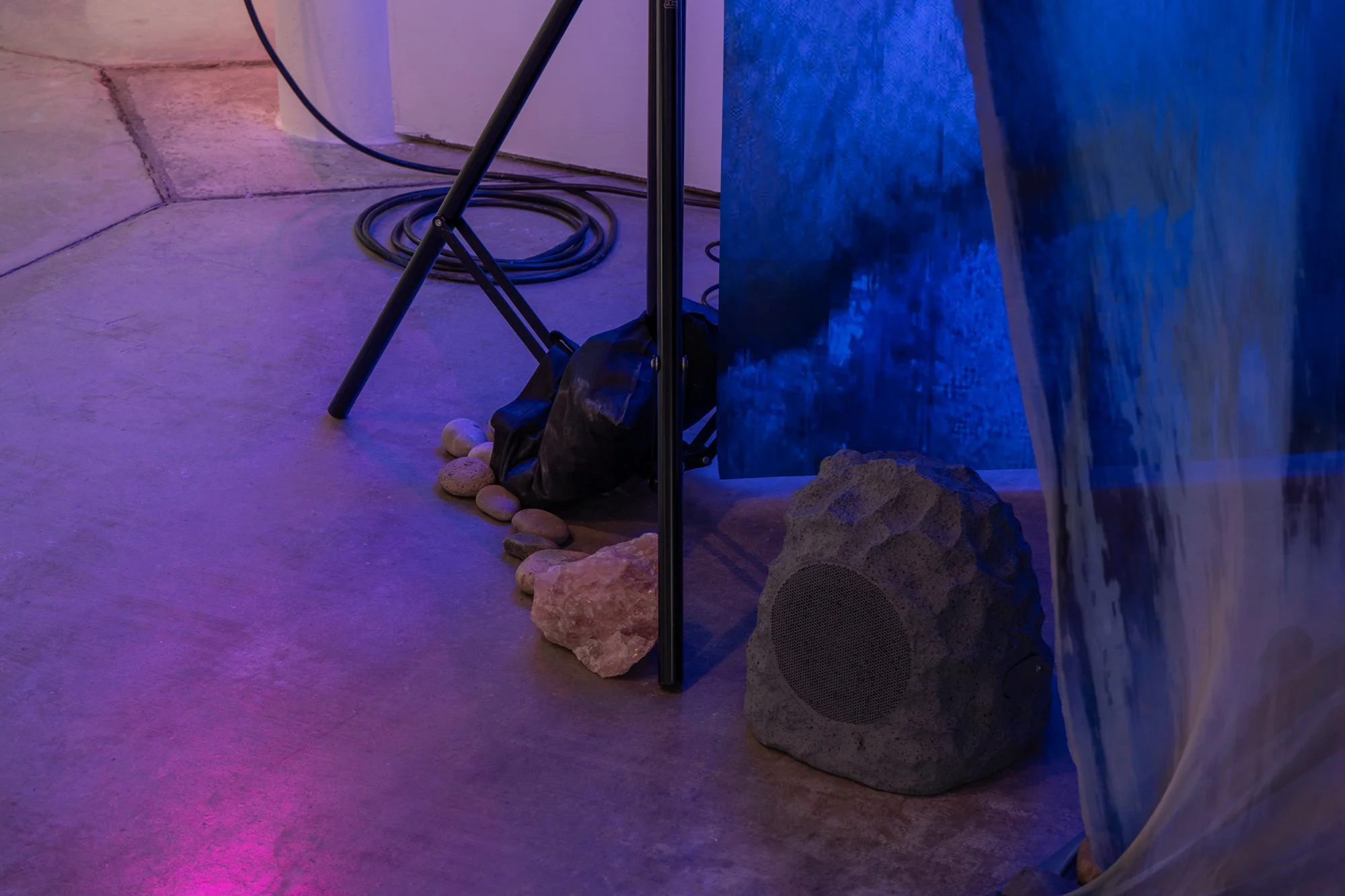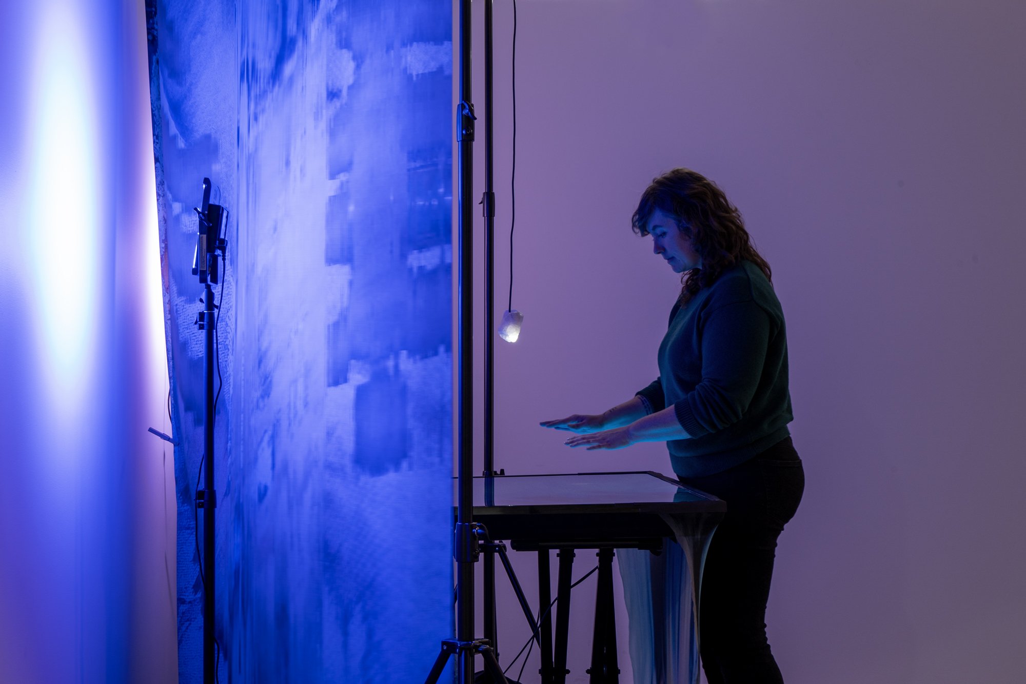 The installation utilizes a monitor lying flat on a pedestal underneath a suspended endoscope to perform video feedback. The viewer is invited to infiltrate the video signal by moving their hands under the camera to generate additional feedback currents across the screen. Video feedback requires subtle camera movements for the image to continuously replicate itself and generate complex patterns, textures, and color variations. When users interact with their hands, skin tones generate dynamic variations in color and patterns. This interactivity is further mediated using TouchDesigner, a visual programming software that enables media artists to create custom programs to run installations and performances. The program designed as part of the installation mixes pre-recorded video clips of different water bodies (oceans, waterfalls, and floods) from footage shot over the last year, mapping my own movements across landscapes. These video clips combined with the live camera, simulate additional “currents” or visual effects across the screen.